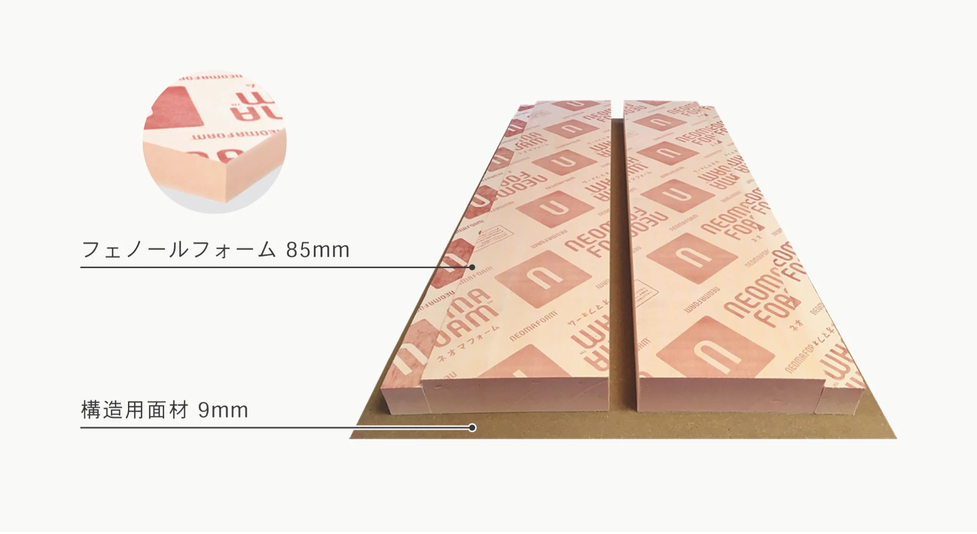 「R+パネル」は、トップクラスの断熱性能と優れた耐久性を併せ持つ「フェノールフォーム」断熱材と、「MDF合板」を組み合わせた独自のパネルです。