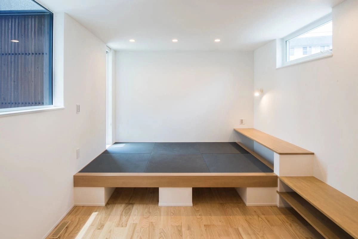 狭小住宅では、収納スペースの確保が重要。そこでおすすめしたいのが、小上がりの下部に収納スペースを設けることです。小上がりとは、床を一段高くしたスペースのこと。