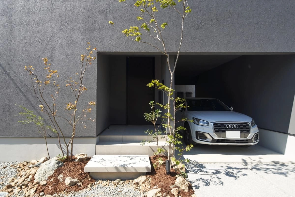 奥行きを感じられるポーチは屋内の土間空間から続き、ポタジェ(家庭菜園)や庭へと繋がる空間として機能。連続性を意識したデザインで、統一感があります。
