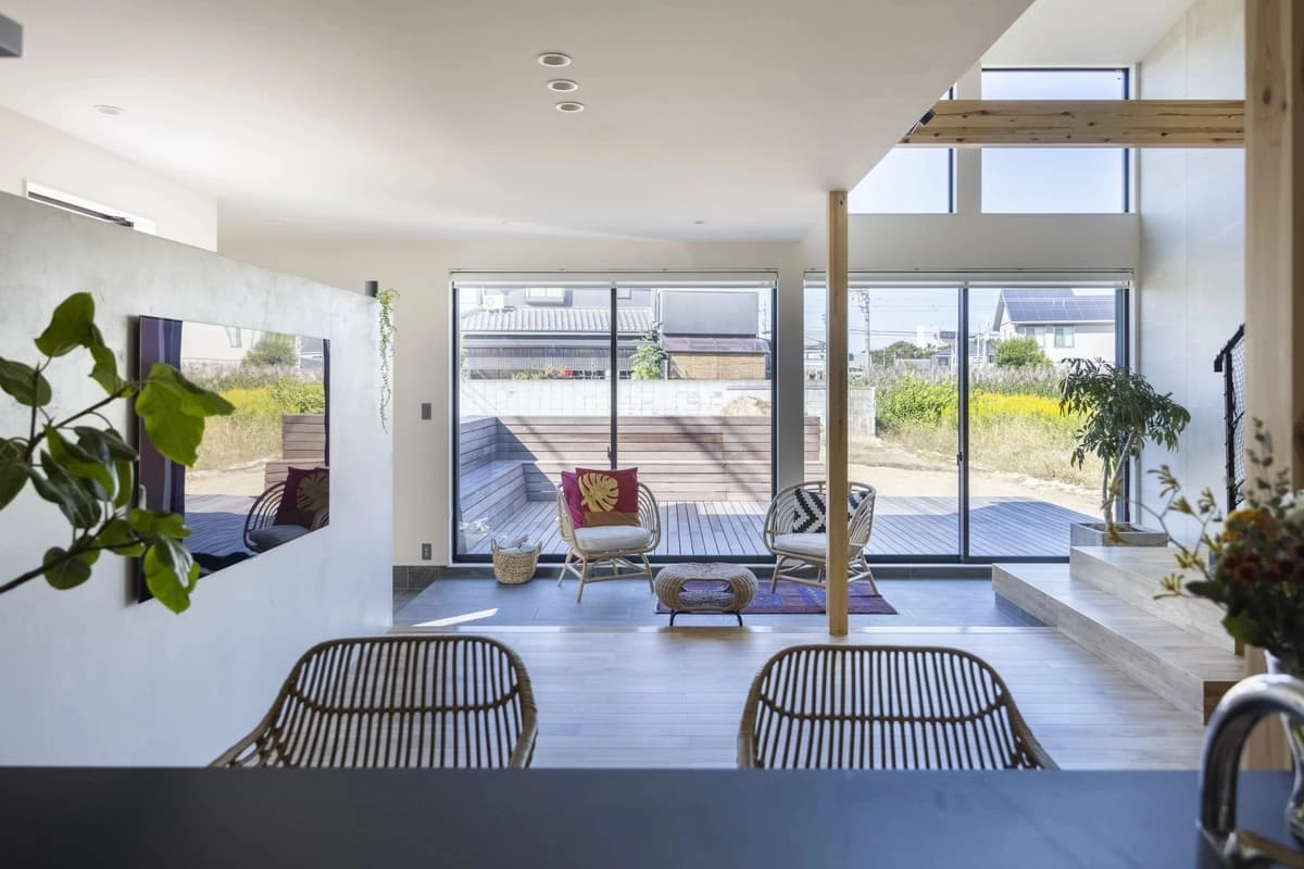 写真④ALTリビングと繋がるウッドデッキ (1).jpg 87.61 KBこちらは、5世帯9人が暮らす多世帯住宅です。通りから見える側面は、窓を極力減らし、プライバシーに配慮しました。一方で、リビングは窓が大きくとられており、開放感のあるスッキリとモダンな印象です。ウッドデッキは、家族みんなが集まっても充分くつろげるスペースとなっており、バーベキューなどを行えて、家族がともに過ごせる時間を確保できます。親世帯が生活する部屋に続く土間は、和テイストに仕上げており、それぞれの好みをしっかりと取り入れられています。ほどよい距離感のある間取りで、各世帯が自分のくらしを大切にしやすい住宅です。