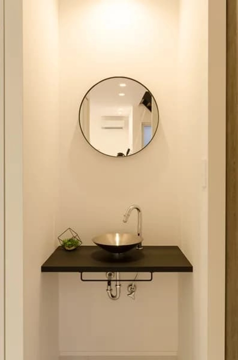 家族2人同時に身支度できるため、朝の忙しい時間帯にも慌てずに済みます。生活感を出さないコツは、洗面用品などのグッズをしまえる場所を別につくることです。また洗面所に使用する色をモノトーンに絞ることで統一感のある空間に。