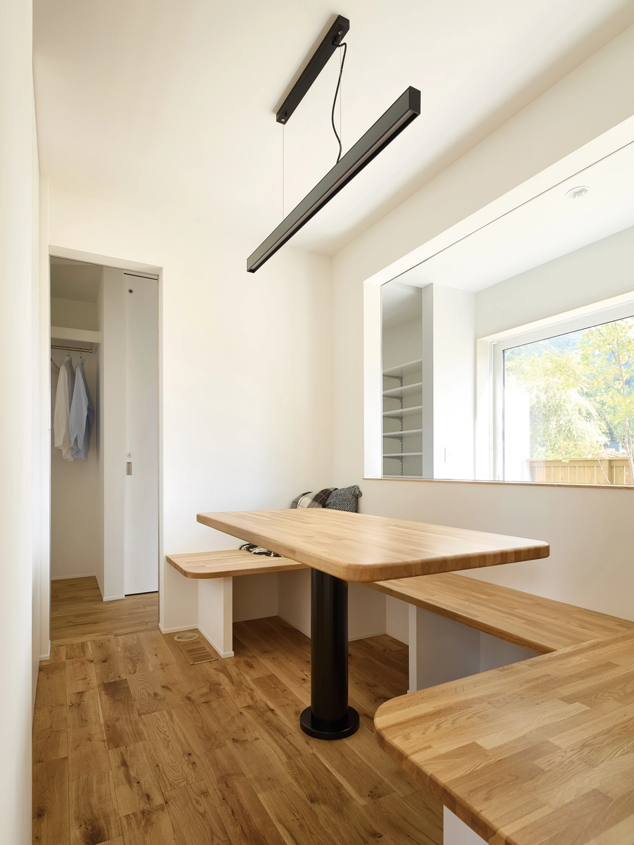 南西側の隣家を避けた位置に開口部を設けることで、日照を取り込みつつ視線の抜けを確保し、広がりのあるリビングを目指した。スタディを繰り返すことで快適な居場所を提案できた。