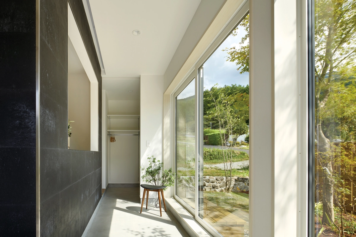隣地が棚田状に連なる環境を踏まえ、高低差に配慮しながら良好な景観を積極的に取り込む計画とした。外部には塀や前庭を、内部には土間やスタディスペースを設け、プライバシーの濃度が段階的に深まる構成とした。