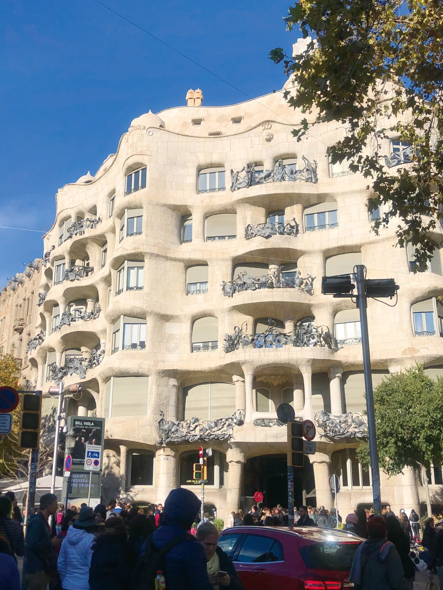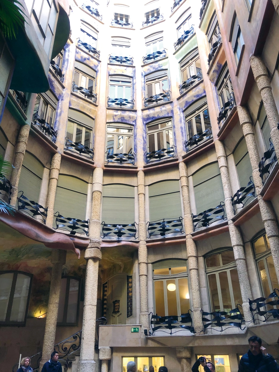 2019 年秋コロナ前に訪れた、バルセロナのカサ・ミラ(1912 年完成)をご紹介します。皆さんもよく知っている世界一有名なアパートで、現在でも一部賃貸住宅として利用されている世界遺産です。外観の特徴として直線がほとんど存在せず、波のようにうねる石のファサードや屋上テラスが有名ですが、ここでは構造について話したいと思います。建設当時としては極めて革新的な、柱と床で支える、集合住宅として間取り変更が自由で合理的な構造です。その合理的な構造は柱と梁が整理された中庭を見ると解ります。あの造形的な石のファサードは吊られていて荷重を支えていないんです。カサ・ミラは彫刻のように見えて、実は非常に理想的な構造体なんですね。