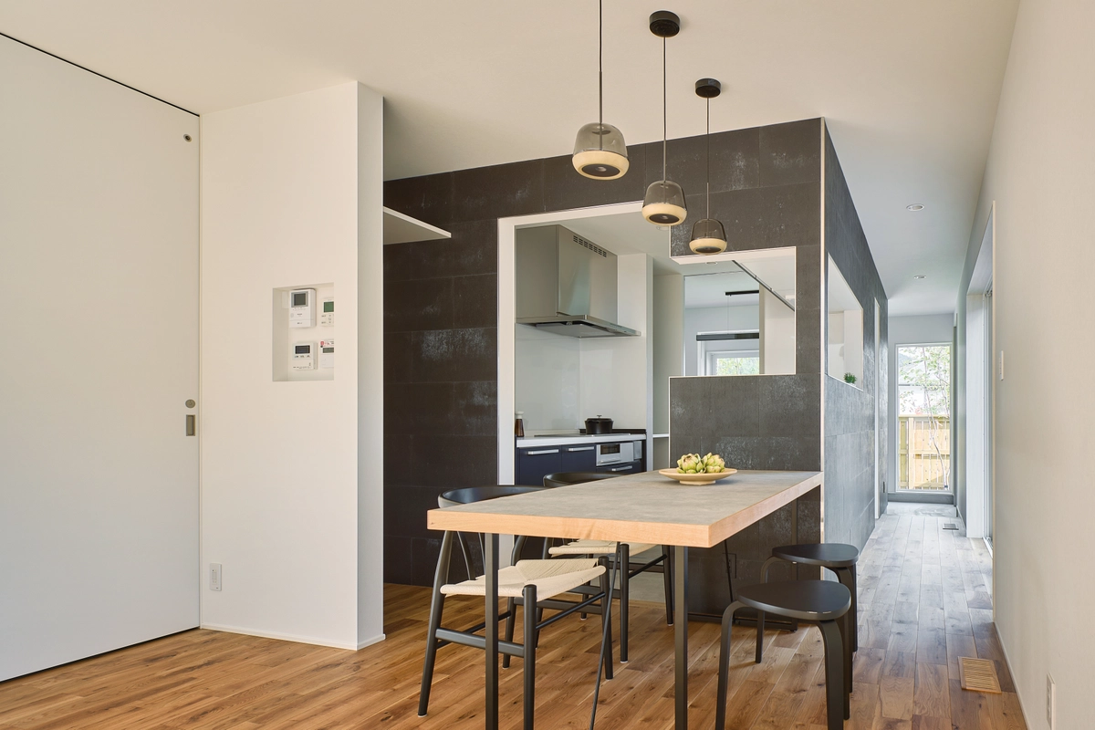 入れ子状に設えたキッチンを内包する黒く塗られたボリュームは、空間を明確に分節する機能も併せ持つ。