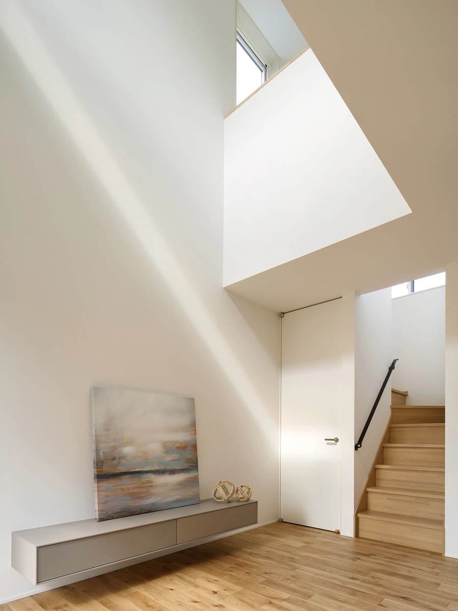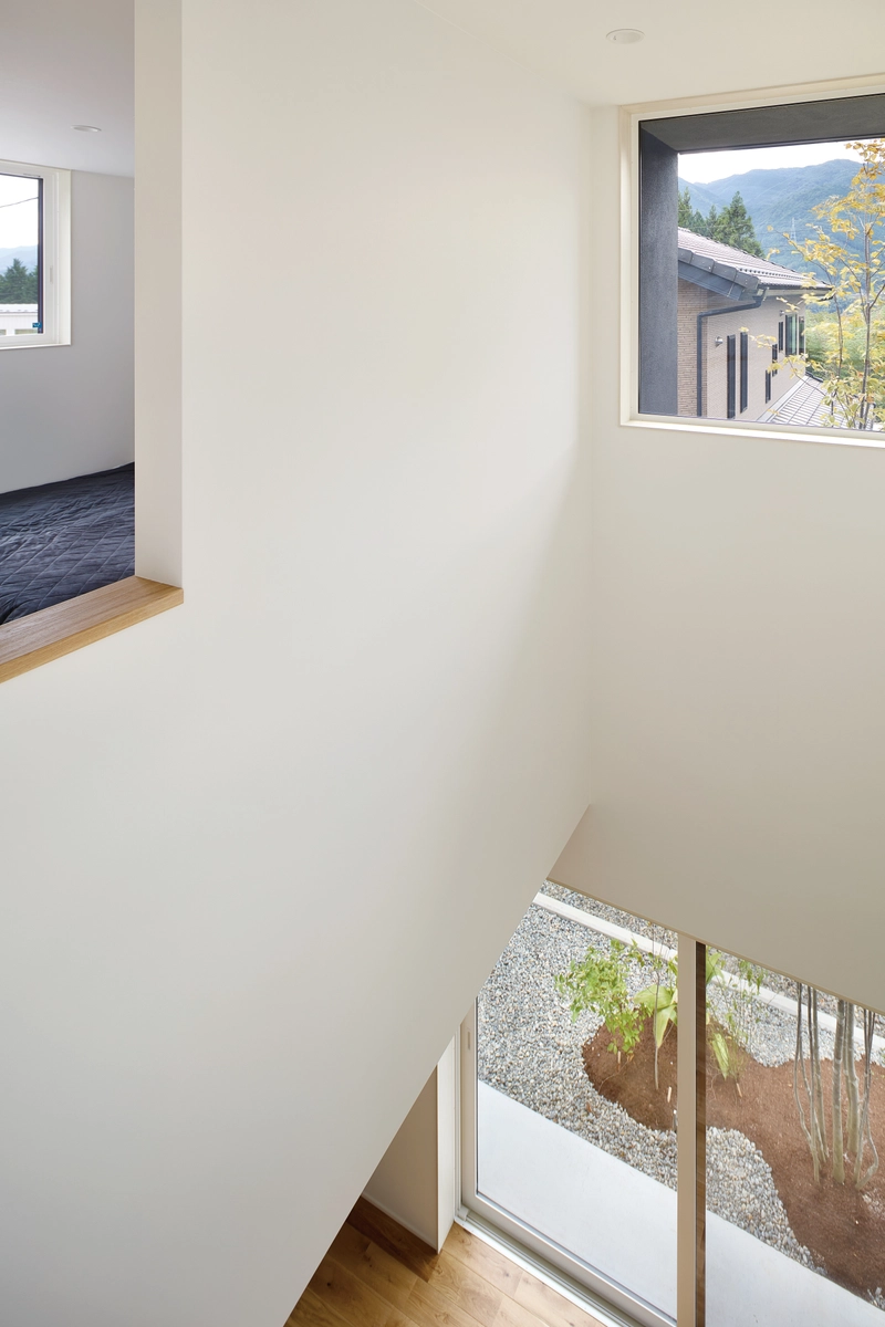 上下を繋ぐ階段は、折り返すことで北東側だけでなく南西側の風景も取り込む、開放的な吹き抜けとした。