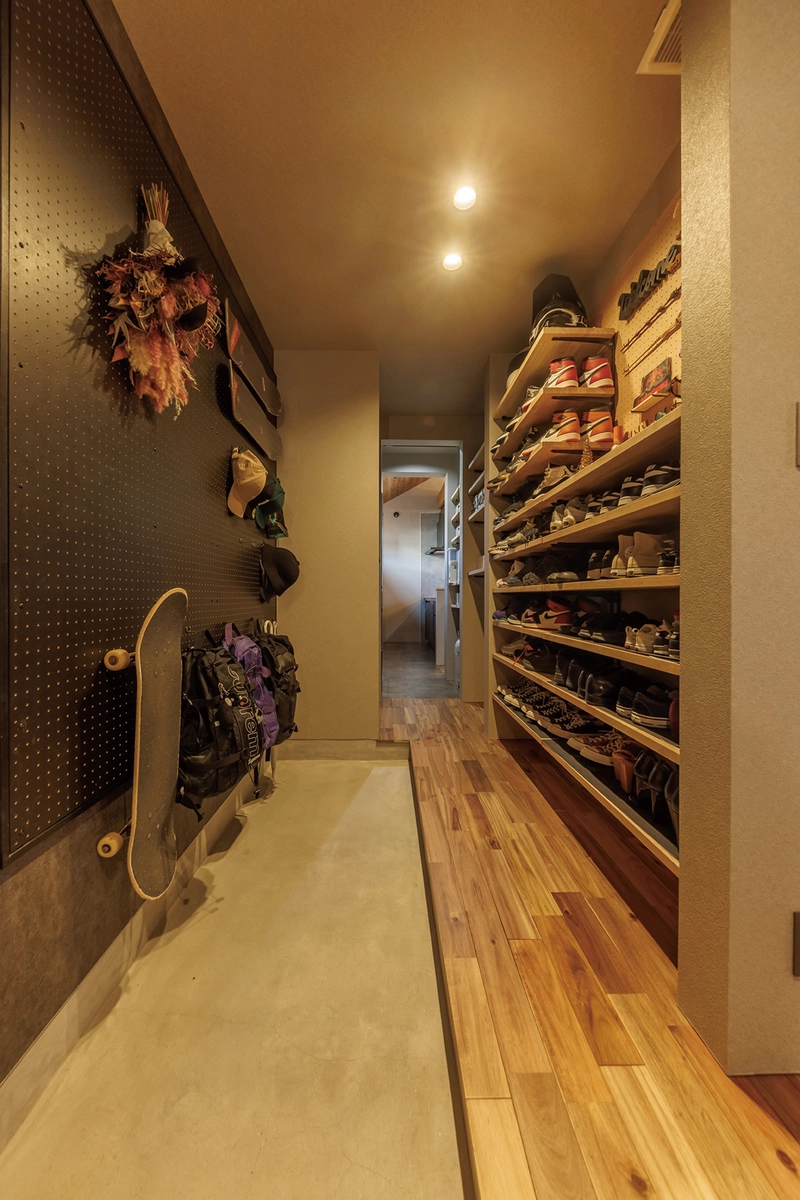 よくぞこのコラムに声を掛けてくださいました。ギター、革ジャン、デニム、マンガ…。奥さんが呆れ果てるほどの没入志向と酷い収集癖があるので、この連載は僕だけで回せる自信があります。今回はまずその拠点について。自宅のどまんなかにリビングを押しのけてスタジオを作りました。家の中心に軽音部室。防音仕様ですが、窓を設けてちょっと音が漏れるようにしています。これを書いている今も、三つ子たちの鳴らす音が吹き抜けを通じて聴こえてきます。どうでもいい音に潜む、彼らの瞬間的な試みが分かります。部室でのささやかな自己探求、そして仲間と何かを企む時間は自らを振り返っても本当に美しいものです。プランのなかに「部室」、いかがですか?