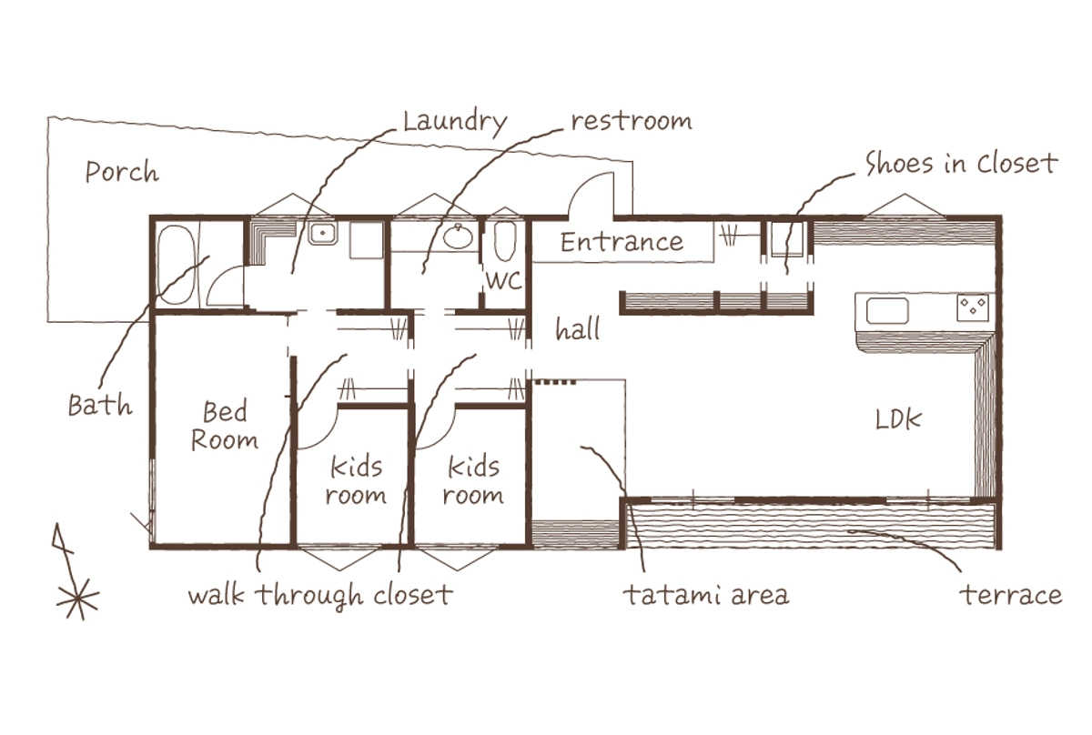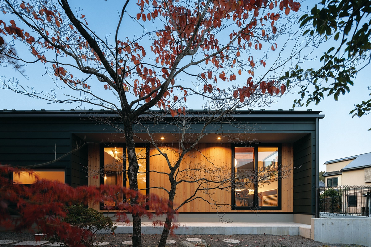 お客様から求められた要望は空間としての“非日常性”と動線や住みやすさとしての“回遊性”でした。南側にはご実家のよく手入れをされた庭があり、その借景をプランの起点として、きわめて抽象的でシンプルなファサードの平屋の佇まいをご提案しました。合理的に通路を省くのではなく、暮らしながら回遊する楽しさを感じられるように、細長いボリュームの中にあえて通過できる空間を散りばめるようなプランとしています。