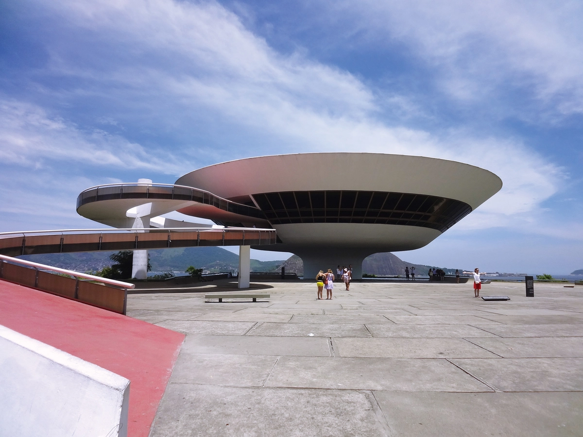 十数年前に訪れた、ニテロイ現代美術館(1996年開館)をご紹介します。ニテロイ市は、リオデジャネイロから車で15分程度、湾を隔てた対岸にあります。ブラジル建築の巨匠オスカー・ニーマイヤーによって設計された美術館は、自由な曲線と、花をイメージして生まれた形が特徴的です。岬の先端に建つ個性的なデザインの建物ですが、周辺の山々や自然の風景の中で不思議なほど違和感なく存在します。内部は美術品の展示はもちろん、360°の風景が楽しめるよう設計されており、リオの街を眺めることもできます。地元の人々からも愛されるこの建築は、ニーマイヤーが88歳の時に手掛けた作品。自分自身も、永く自由な発想を持って設計に取り組みたいと感じさせられる経験となりました。