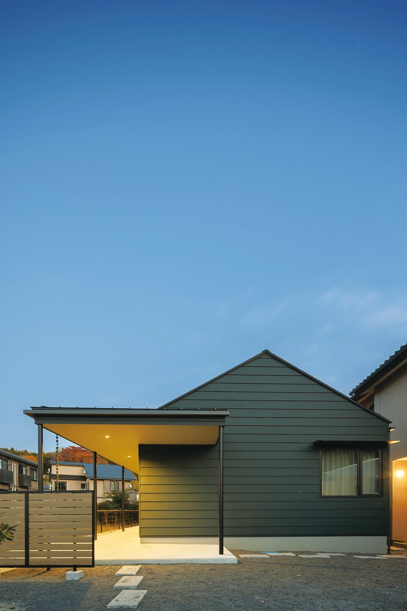 薄暮の時間になると温かな照明が軒下を照らし、玄関までのアプローチを演出します。