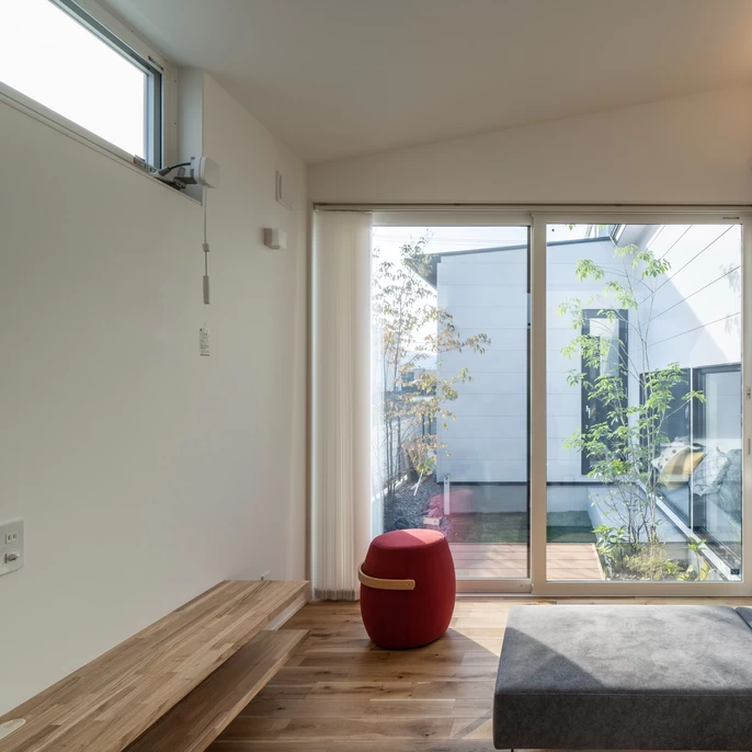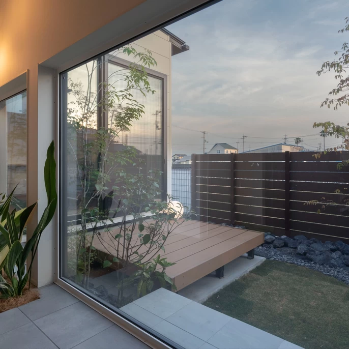 外からの視線を遮りながら、光と緑だけを取り込む中庭。玄関・ダイニング・リビングのどこにいてもその存在を感じられ、住まい全体に広がりと落ち着きを与えます。外に出なくても、自然を感じられる場所です。