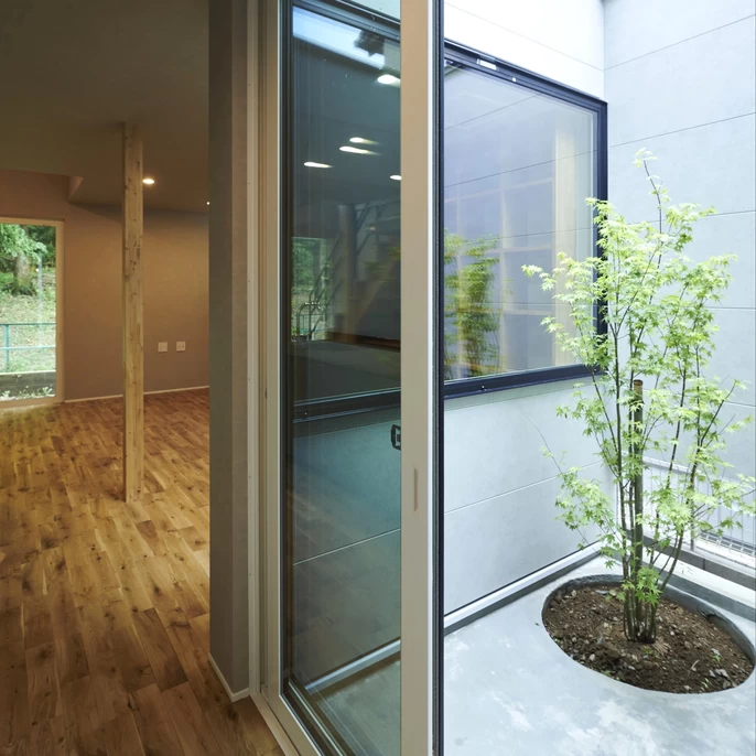 打ち合わせを重ねる中で、建築家がお施主様の理想をくみ取り実現した坪庭。採光・通風の面でも重要な役割を果たし、室内の隅々まで光と風を届けてくれる機能的なデザインです。