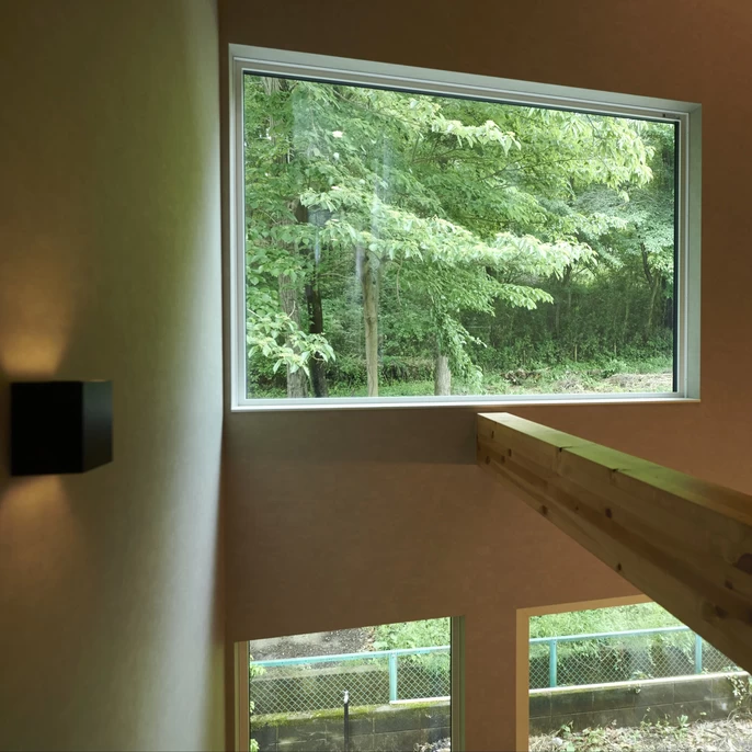 南側の吹き抜けに設置された窓は、美しい景観を見ることに特化し、まるで森の風景を室内に取り込んだかのよう。階段を上り下りするたびに、キッチンに立つたびに、癒しを感じられるこの住まいのシンボル的な存在です。