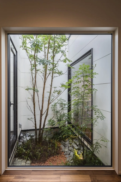 玄関をくぐると、緑のある中庭があり、四季折々の変化する植物が心を癒やします。外観はスリットや板張りで変化をつけ、単調さを回避したデザイン。夜にはスリット窓からこぼれる明かりが外壁を彩り、昼とは異なる幻想的な表情を楽しめます。