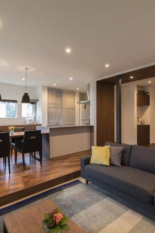 開放感あふれる広々としたLDK。リビングはダイニング・キッチンより一段低いステップダウンフロアで、空間に動きを持たせ広がりを演出。癒しの空間がここにあります。