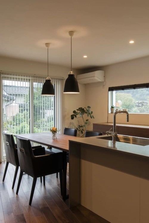 大きな窓はまるで風景を切り取った雰囲気。たっぷりと自然光が差し込む明るいキッチンは、すぐ隣にテーブルを配置できるので、料理の準備や片付けもスムーズです。キッチンの対面に座ればカウンターのように使え、家族や友人との会話も弾みます。