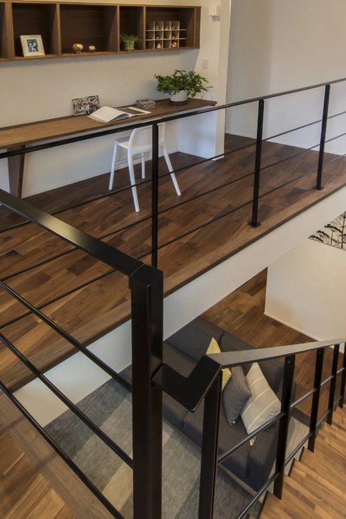 階段を上がると2階にはスタディコーナーが。吹き抜けとスチール階段でLDKとつながり、2階にいても一体感を感じられる開放的な空間設計。家族の気配をいつでも感じられます。