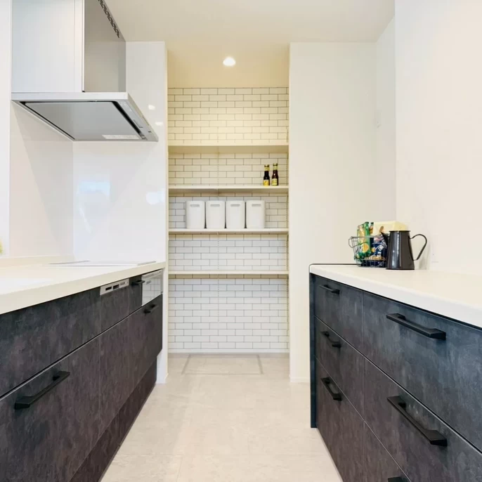 落ち着いた黒と白の組み合わせが映える、開放感と上質さを両立した使いやすいデザインキッチン。手元のカウンターは、出来立ての料理をサッと出す配膳の架け橋に。 「作って、食べて、片付ける」がスムーズで心地よい時間になります。