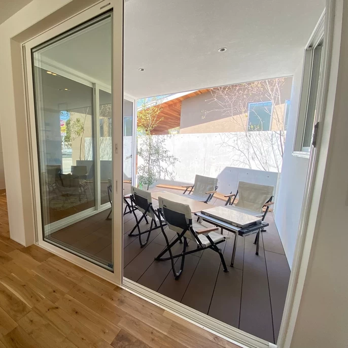 リビングの窓を開け放てば、テラスまでが一つの大空間に。リビングとゆるやかにつながり、落ち着きと静けさが漂う空間になっています。 忙しい家事の合間に外の風にあたって深呼吸したり、休日は日向ぼっこを楽しんだり。 何気ない日常に「余白」と「癒やし」をもたらす、家族のための特別な場所です。