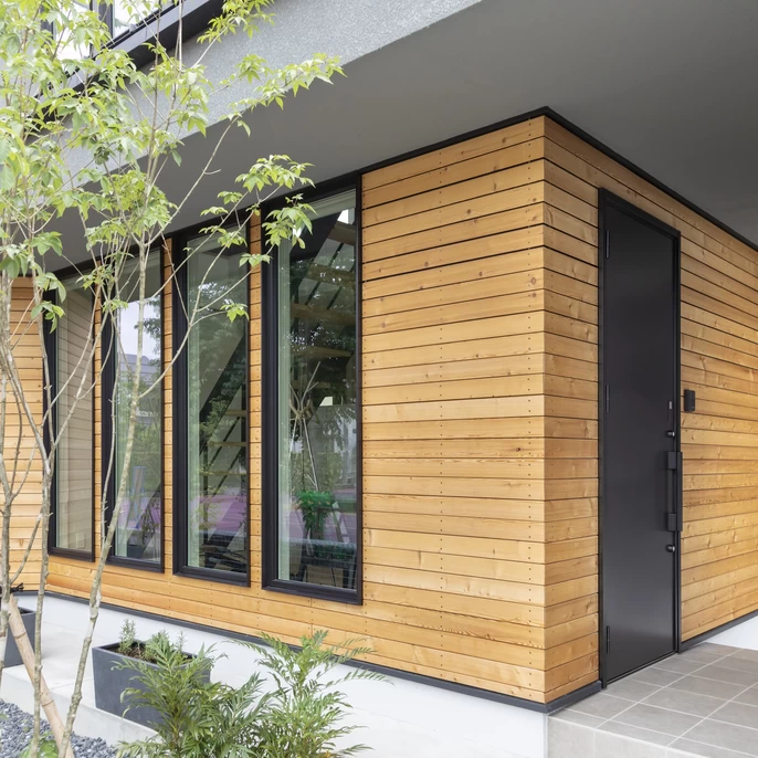 やわらかなグレー外壁に木の温もりが寄り添い、洗練さと親しみやすさがほどよく重なる外観。訪れる人を心地よく迎え入れる上質なエントランス空間です。