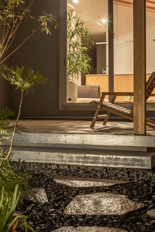 リビングから続くタイル敷きのテラスは、家族や友人と楽しむBBQやホームパーティーが楽しめます。大きな窓越しに庭と室内がつながる開放的な設計が特徴です。