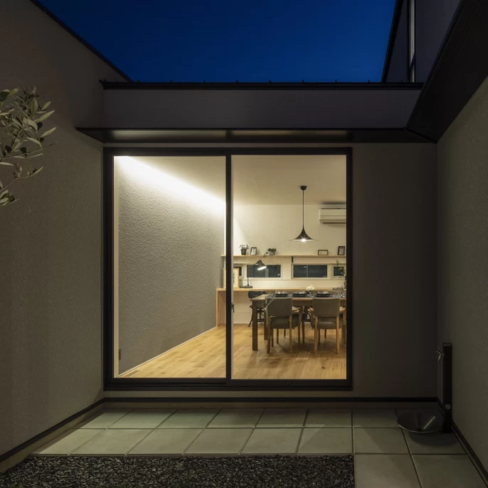 中庭に繋がるリビング 、開放感のある平屋