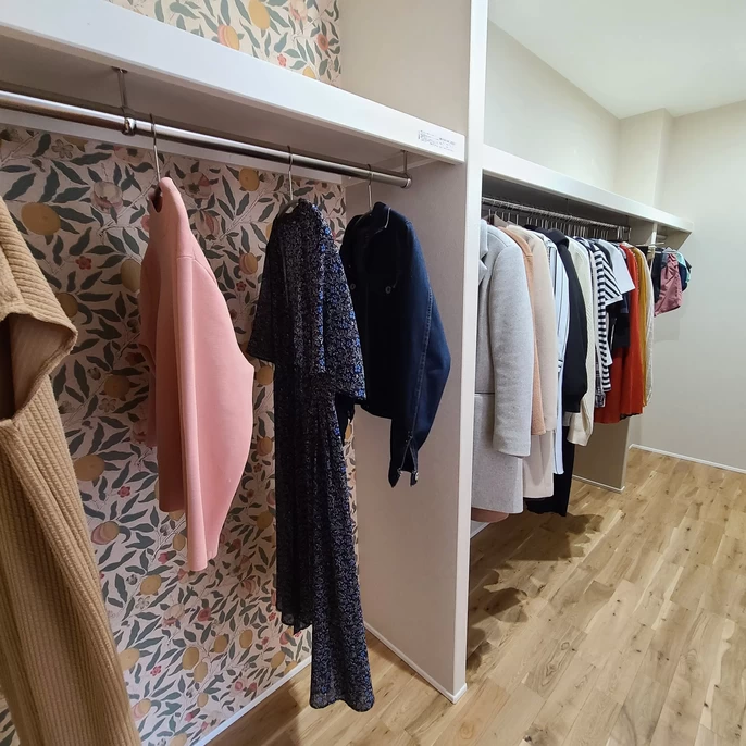 家族全員の衣類をまとめるファミリークローゼットや、玄関の大型シューズクロークで散らかり知らず。キッチンにはパントリーと背面収納を完備し、家電やストックもすっきり隠せます。適材適所の収納ができるように設計されています。