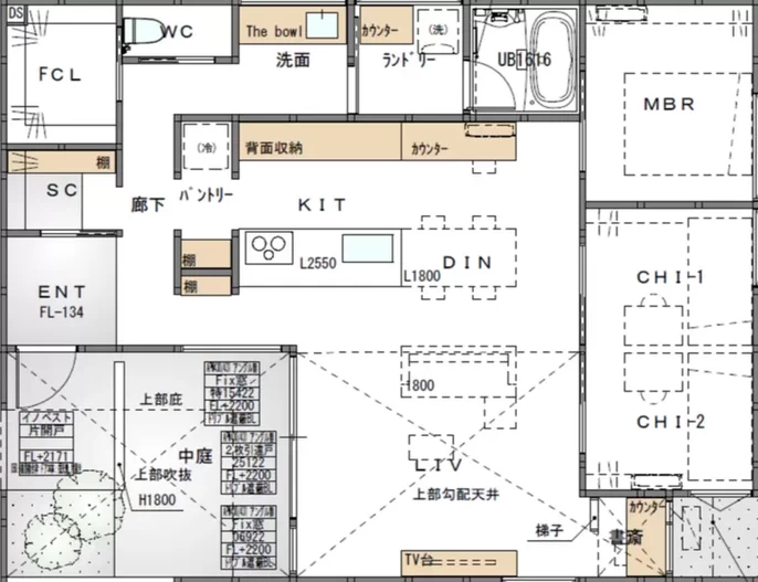 平屋ならではの屋根形状を活かした「勾配天井」が、圧倒的な高さと開放感を生み出します。さらにキッチンからリビング、中庭へと視線が抜ける設計により、実際の面積以上の広がりを実現。縦にも横にも伸びやかな大空間LDKは、家族みんながのびのびと過ごせる、光あふれる場所です。