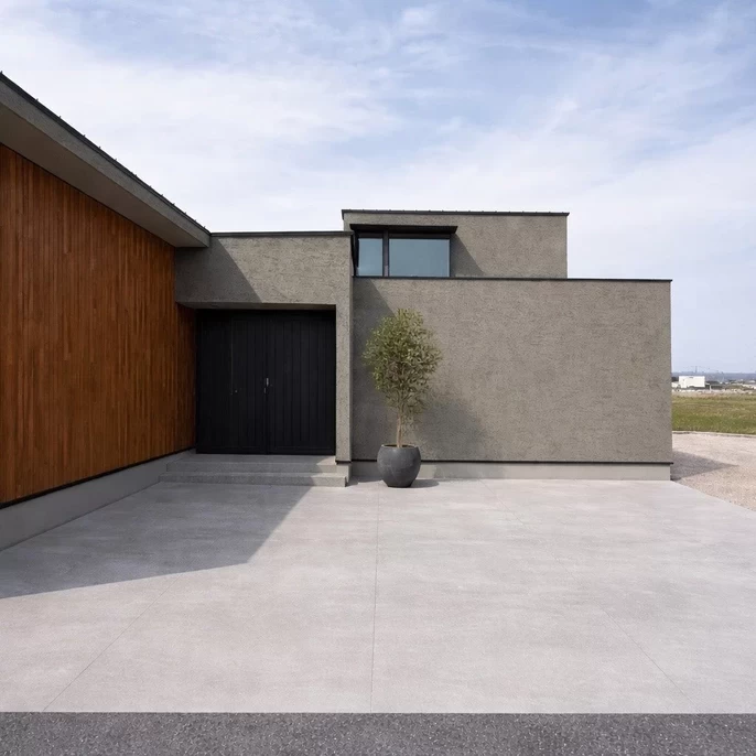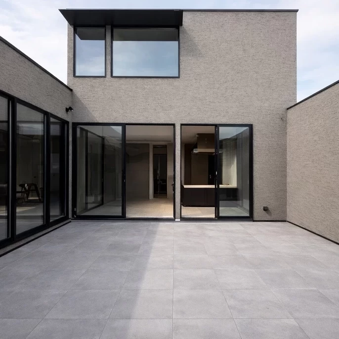 「外部から閉じられたファサードに対して、内部には空の変化を感じられる小さな吹き抜けと中庭を設けました。プライバシーを守る壁と、平屋ベースの機能的な動線が、ご家族に静かで豊かな時間をもたらします。」