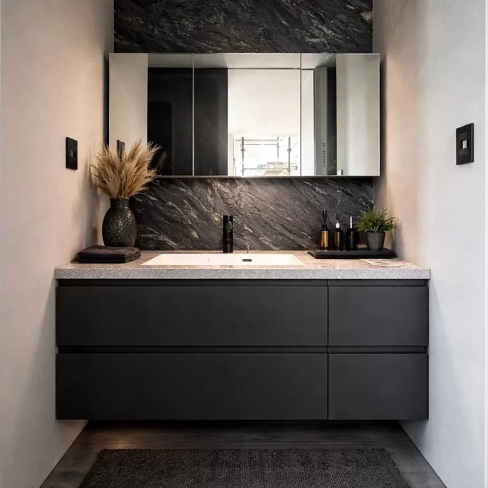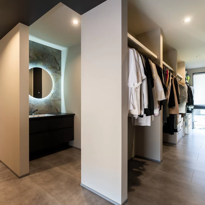 空間の広がりを感じさせる鉄骨階段や、間接照明が映える重厚な洗面台、テレビ背面のタイルなど、建築家ならではの洗練されたデザインが随所に。毎日ホテルに泊まっているかのような上質感を味わえます。