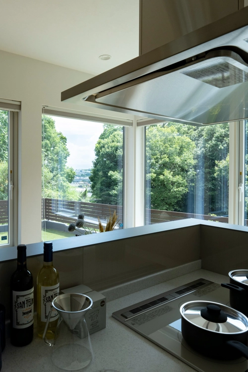 ソファに腰をおろすと、開放的な窓から山々の眺めが目前に広がります。また、出窓のベンチも造作し、腰をかけて家族団欒の時間が楽しめます。