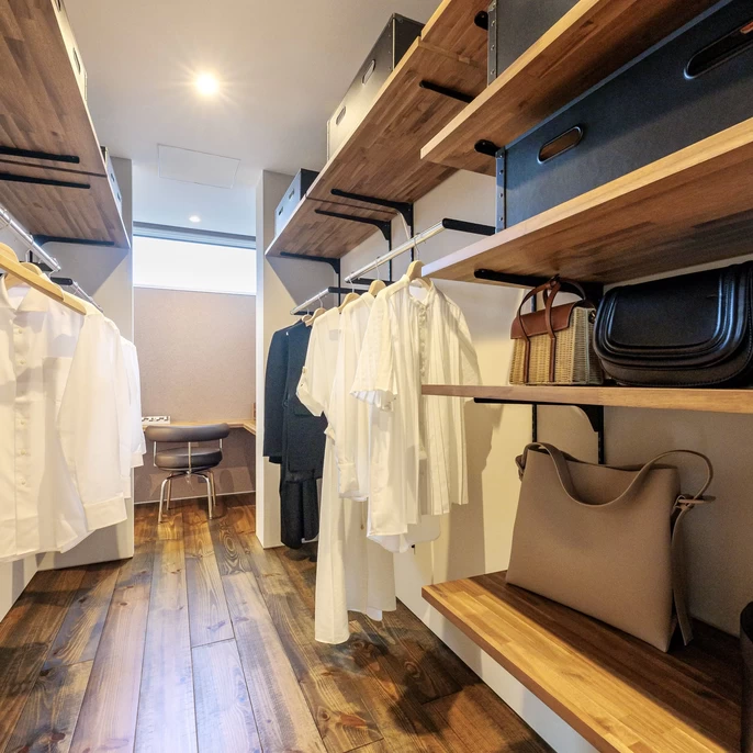 家族みんなの衣類や小物をまとめて収納できる、大容量のファミリークローゼットを完備。家事の負担を軽減し、常にすっきりと片付いた住空間を保つことができます。