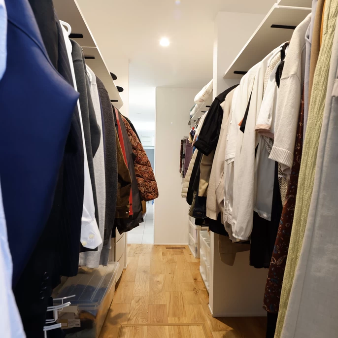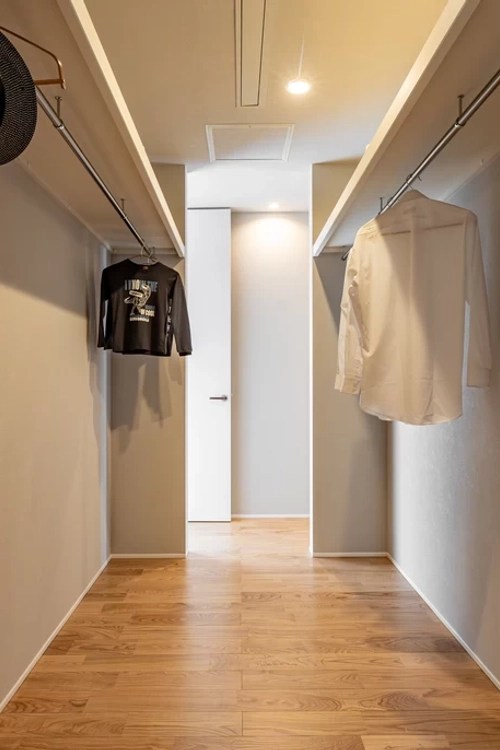 大容量のファミリークローゼットは、家族全員の衣類や日用品をすっきりと収納でき、暮らしが整います。