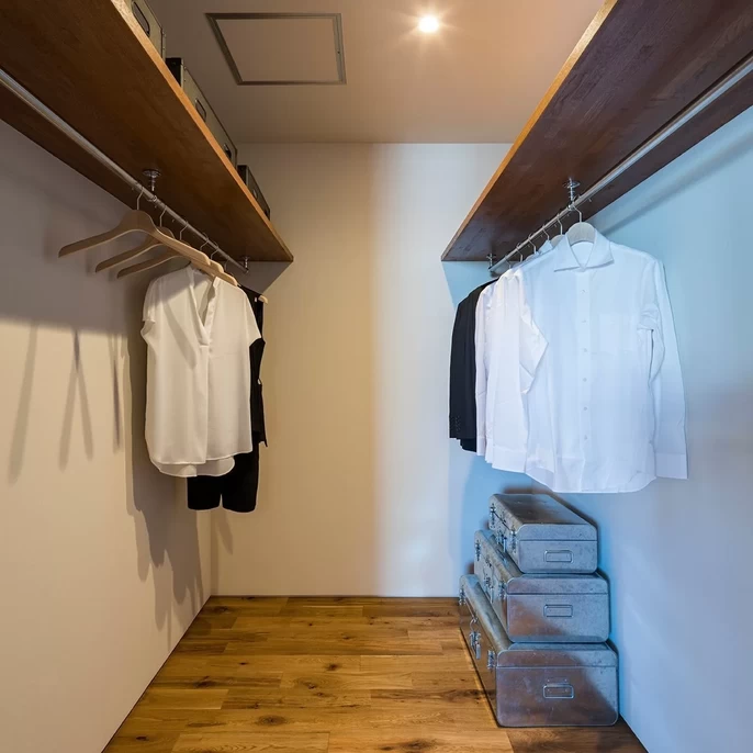 ランドリールームのすぐ横にファミリークローゼットを配置し、洗濯後は最短距離で収納。キッチン奥には大容量のパントリーを、各所には扉付きのクローゼットを設け、生活感を見せない暮らしを叶えました。