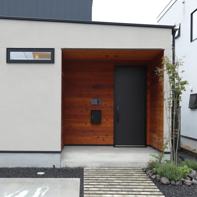 深い軒のある屋根付きポーチで、雨の日でも安心して出入りが可能。広々とした玄関の奥には、ゴルフバッグやコートもスッキリ収まる大容量のシューズクローゼットを完備しました。