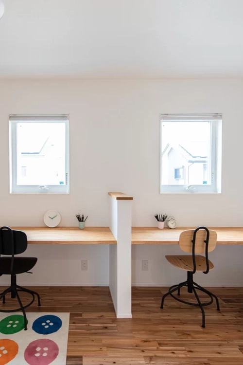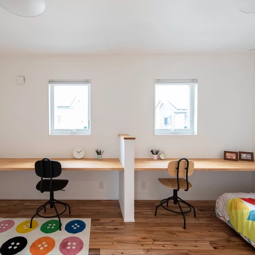 子供部屋は成長に合わせて仕切ることが可能。初めは広々とした共有空間で笑顔があふれ、おもちゃや絵本で楽しめます。成長と共に2室に分け、プライベートを重視。子どもの変化に応じたやさしい設計で、親にも安心の住まいです。