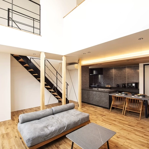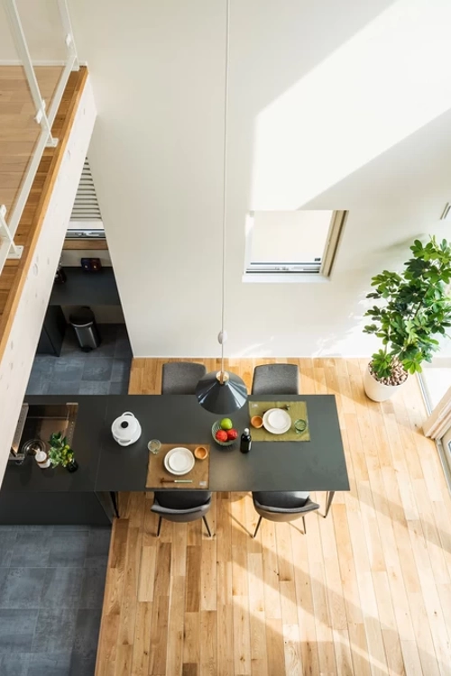 つながりを意識したこのコーナーは、1階と2階の雰囲気を共有し、家族のコミュニケーションを育みます。大きな窓からは広がる景色が楽しめ、開放感をさらに高めます。