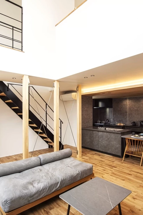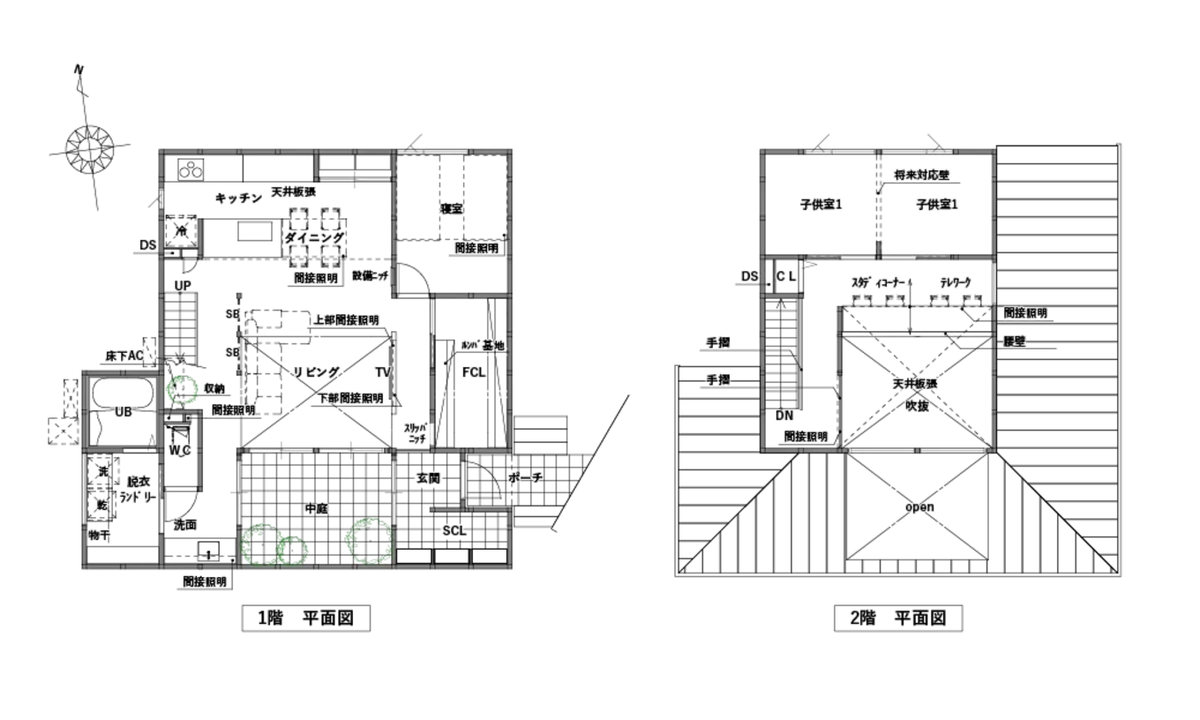リビングからつながる中庭は、外の光を採りこみ、家全体に心地よい開放感をもたらします。1階にはご夫婦の寝室を配置し、2階にはスタディコーナーを備えた子ども部屋を設けました。吹き抜けを介して上下階の家族の気配を感じられるので、自然とコミュニケーションが生まれます。