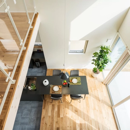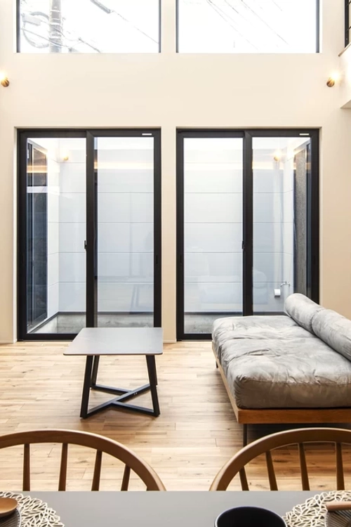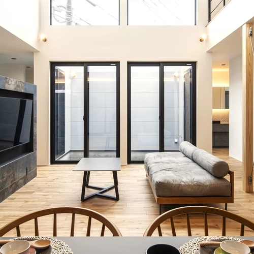吹き抜けと大きな窓のあるリビングは、光が降り注ぐ明るい空間です。中庭に面しているため視覚的な奥行きと、さらなる空間の広がりを生み出しています。