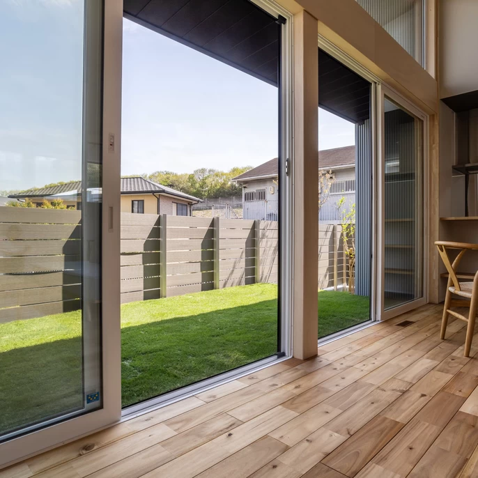 リビングの大開口を開け放てば、テラスと室内がフラットにつながる大空間へ。視線を遮るプライベートな設計により、家にいながらリゾートのような非日常を味わえる、家族だけの特別な居場所です。