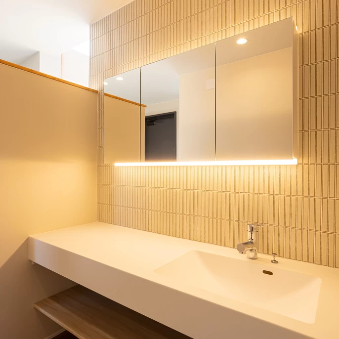 間接照明が灯る大きな鏡のある洗面台は、まるでホテルのような上質感。毎朝の気分を高めてくれます。