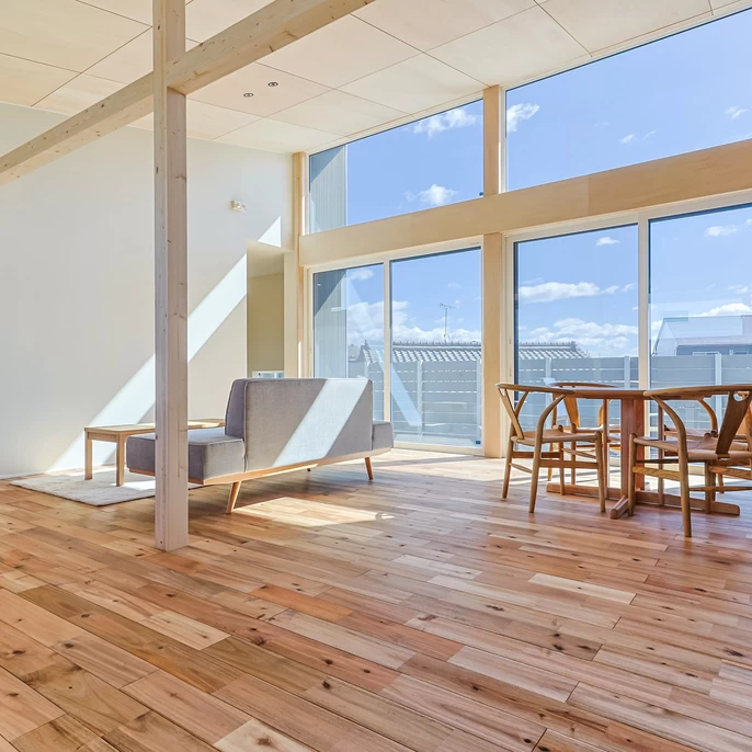 平屋ならではの勾配天井が、実際の面積以上の「広がり」と「ゆとり」を演出。高窓から注ぐ柔らかな自然光が、家族の団らんを明るく包み込みます。リビング横のフリースペースは、ライフステージの変化に合わせて長く使い続けられる賢い設計です。