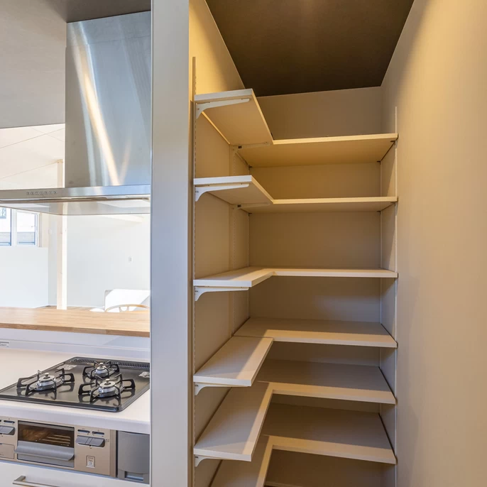 キッチン横には生活感を見せない工夫を施したパントリー。可動棚でスペースを無駄なく使え、ストック品や家電もスッキリ収納。探し物がすぐに見つかる「整う仕組み」が、忙しい毎日の家事時間を短縮します。