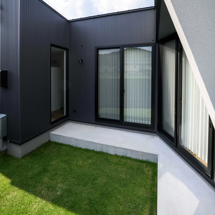L字型に配置された間取りが中庭を囲み、どこにいても外の自然を感じられる設計に。