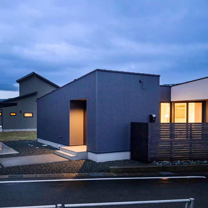 ダークトーンの外壁に、パッと目を惹くホワイトのアクセント。木の温もりを感じる目隠しフェンス。異なる素材を美しく組み合わせた、洗練された外観です。