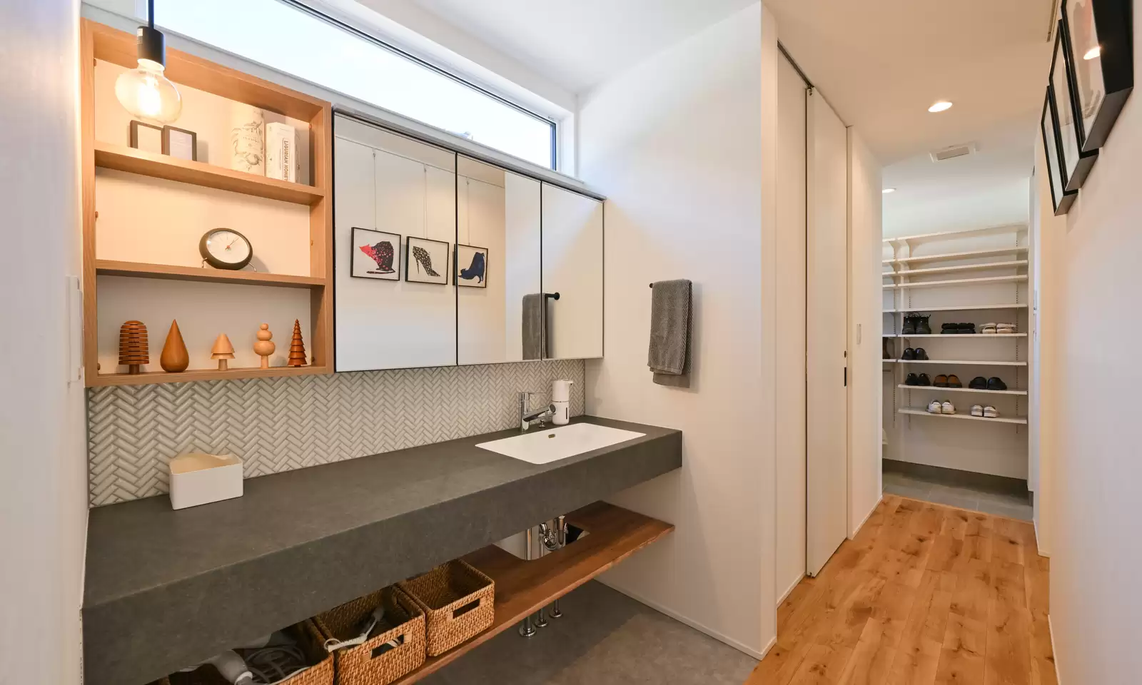 家族玄関から直接プライベートスペースにアクセスする迂回ルートには二人並びで使用も可能な洗面台を設置