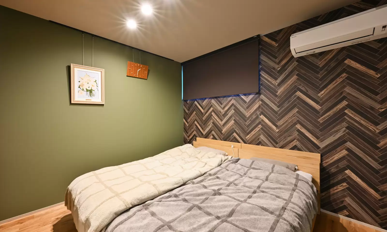 ダークウッドのヘリンボーンパターンで仕上げられたアクセントウォールと、オリーブグリーンの塗装壁が木目との調和が絶妙です。シングルベッド2台にドレッサースペースを加えたレイアウトなど、自由にカスタマイズできる点も魅力です。