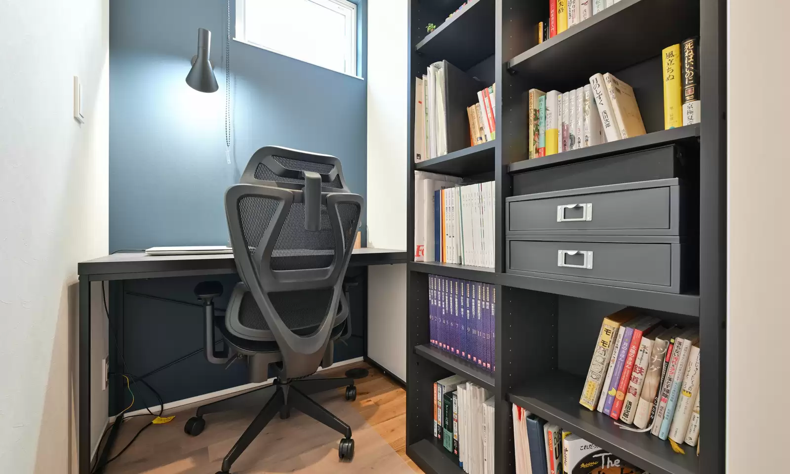 デスクカウンターの背面に本棚を設置することで室内がスッキリと片付きます