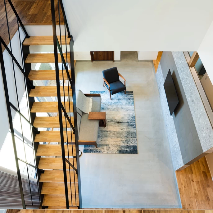 大きな吹き抜けからは、1階を見渡せるだけでなく、2階のスタディコーナーにいても家族と緩やかに繋がることができます。