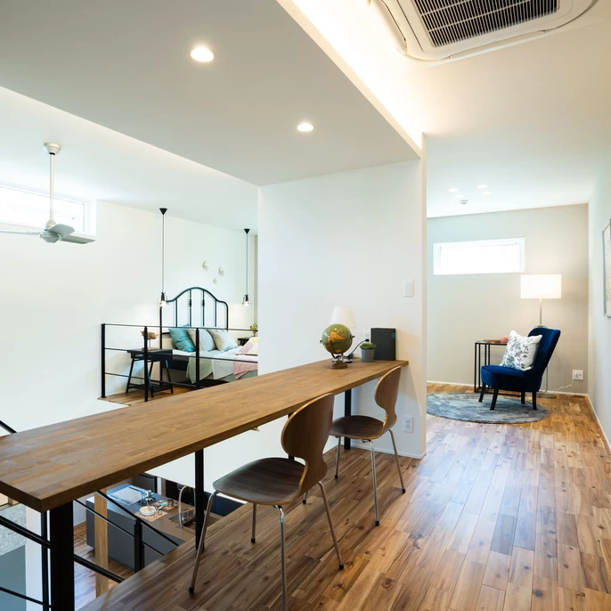 2階の廊下はスタディスペースとして無駄にしない建築家のアイデア。ちょっと作業台として、すこし休憩する場所として、さまざまな用途にお使いいただけます。